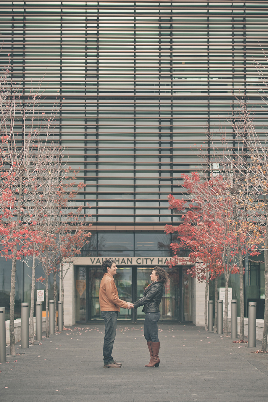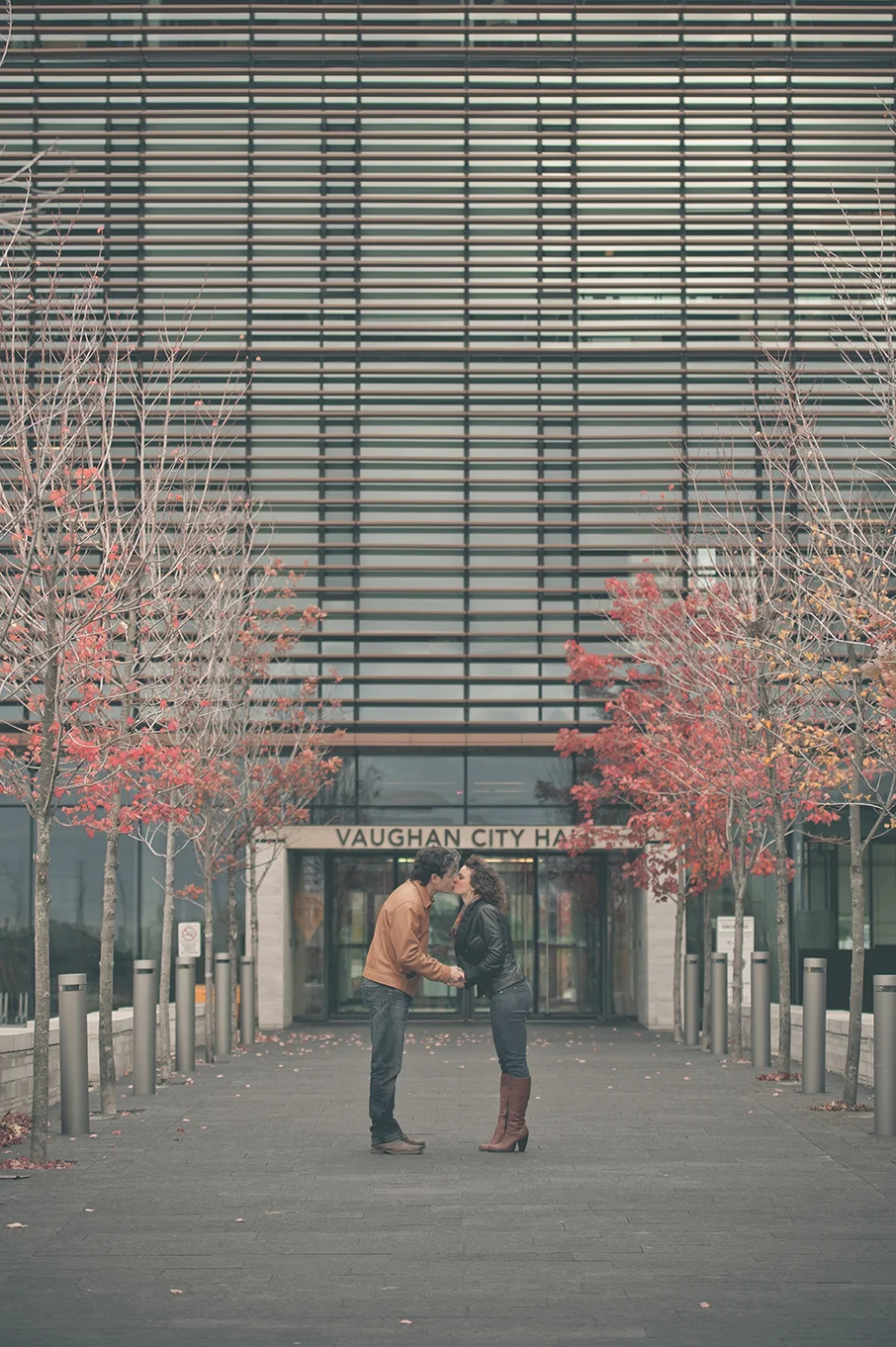 It was approved in April 2003 to build a new City Hall in Vaughan, to meet the needs of the growing community. Construction began in February of 2007 and an official opening was held in 2011. The beautiful new modern building is a great place for photos. The location gave Nina and Joseph the city feel they wanted for their engagement session. It was a chilly day, but we fought through the cold and quickly captured some fantastic shots. We look forward to their golf course wedding next year and had a great time getting to know them during our time together for their engagement photos.